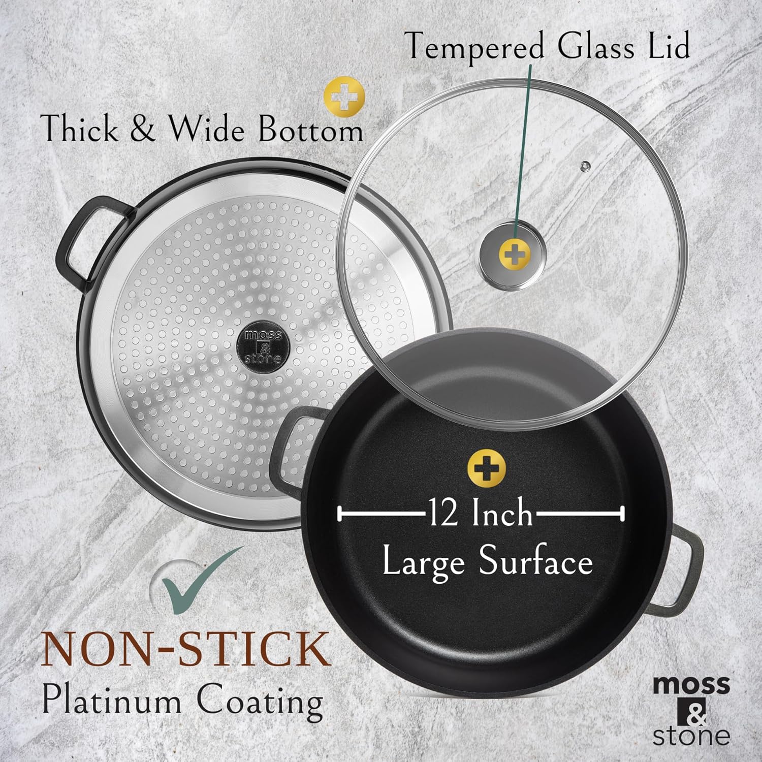 Moss & Stone is a famous company in the field of kitchen appliances & coffee accessories. We are proud to sell you our non stick pan which is one of our best sellers. It’s a unique egg pan or omelette pan made of top materials – casting aluminum that provides break resistant and does not warp, you can make a meal full of flavor with less oil for healthy diet. We offer our frying pans nonstick 12 inch at an amazing sale, so that you can enjoy a good & cheap nonstick frying pan set!