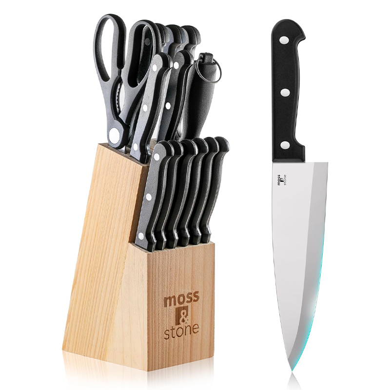 • Easy To Clean Knives: The wooden knife block set is easy to clean and dishwasher safe. A perfect & cheap 14-piece cooking knives set! Customer Support: Moss & Stone knife cutlery wooden block set is covered under our 1-year warranty for our kitchen knife sets!