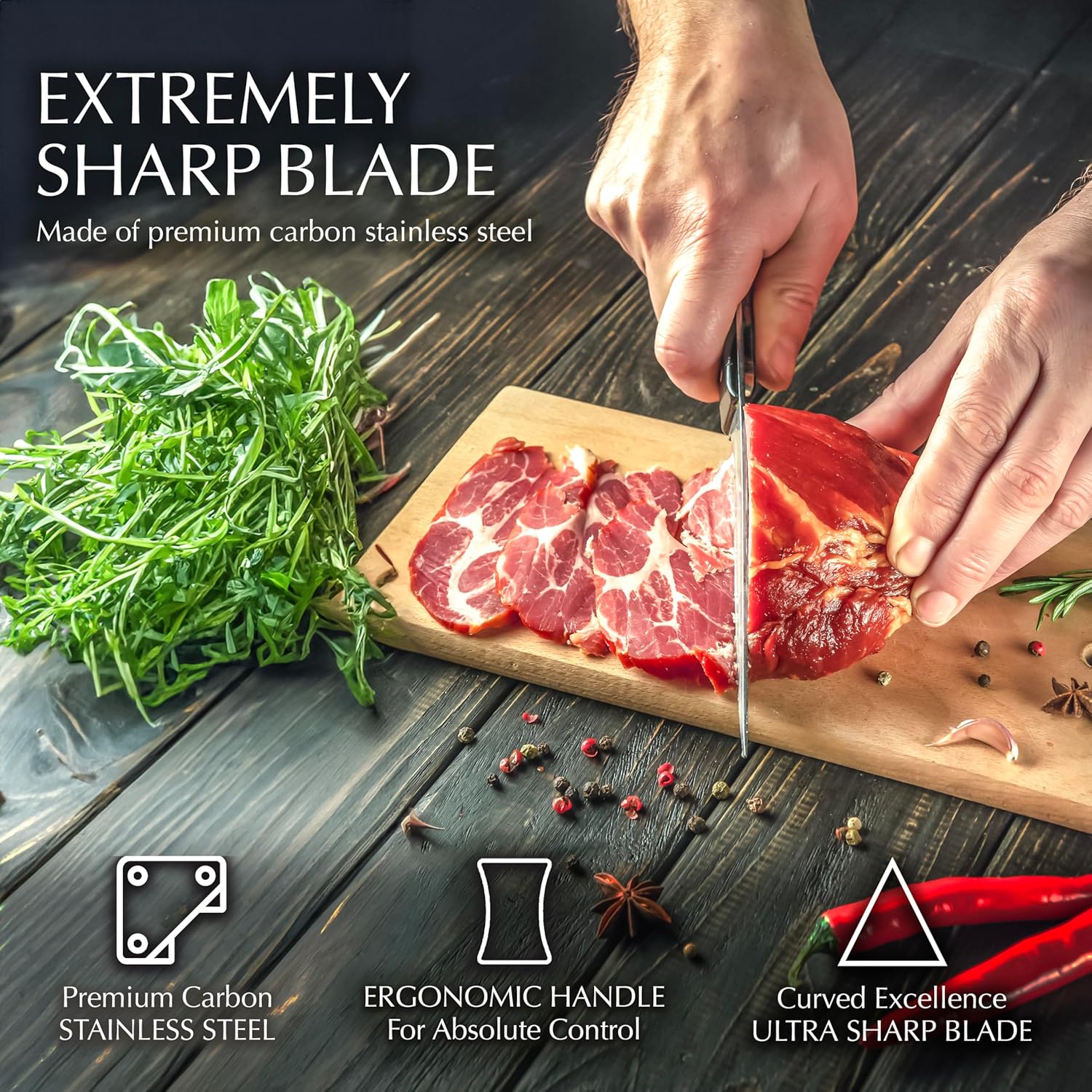 • One Solution For All Your Needs: The complete knives set for kitchen meets all of your food prep needs. As part of the knive set with block, we attach a knife sharpener to maintain the quality; sharpening your nife every often will give you the best result out of your cutting.