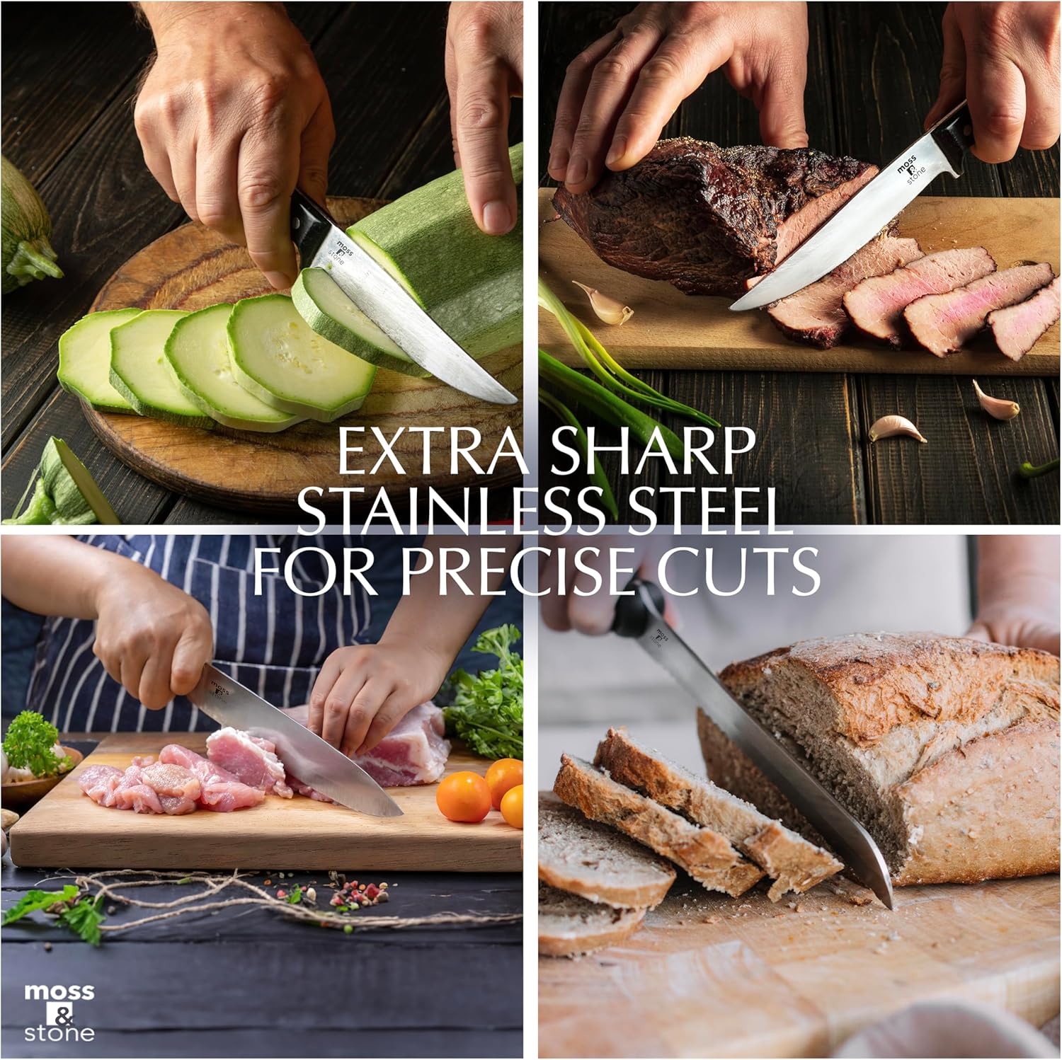 • Easy Slicing And Dicing: Moss & stone is pleased to offer the best kitchen knives for the perfect cutting experience. Our stainless steel kitchen knife set with scissors makes cutting, chopping, slicing, and dicing easier, emphasizing your safety to prevent work accidents.