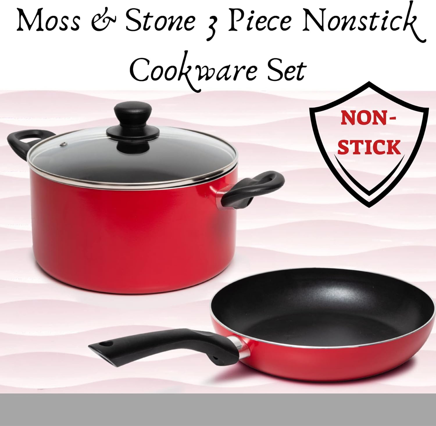 3 Piece Pots & Pans Set Nonstick Cookware Set, Aluminum Pots and Pans, Red Pots and Pans Set with Glass Lid, Dishwasher Safe, Cooking Set