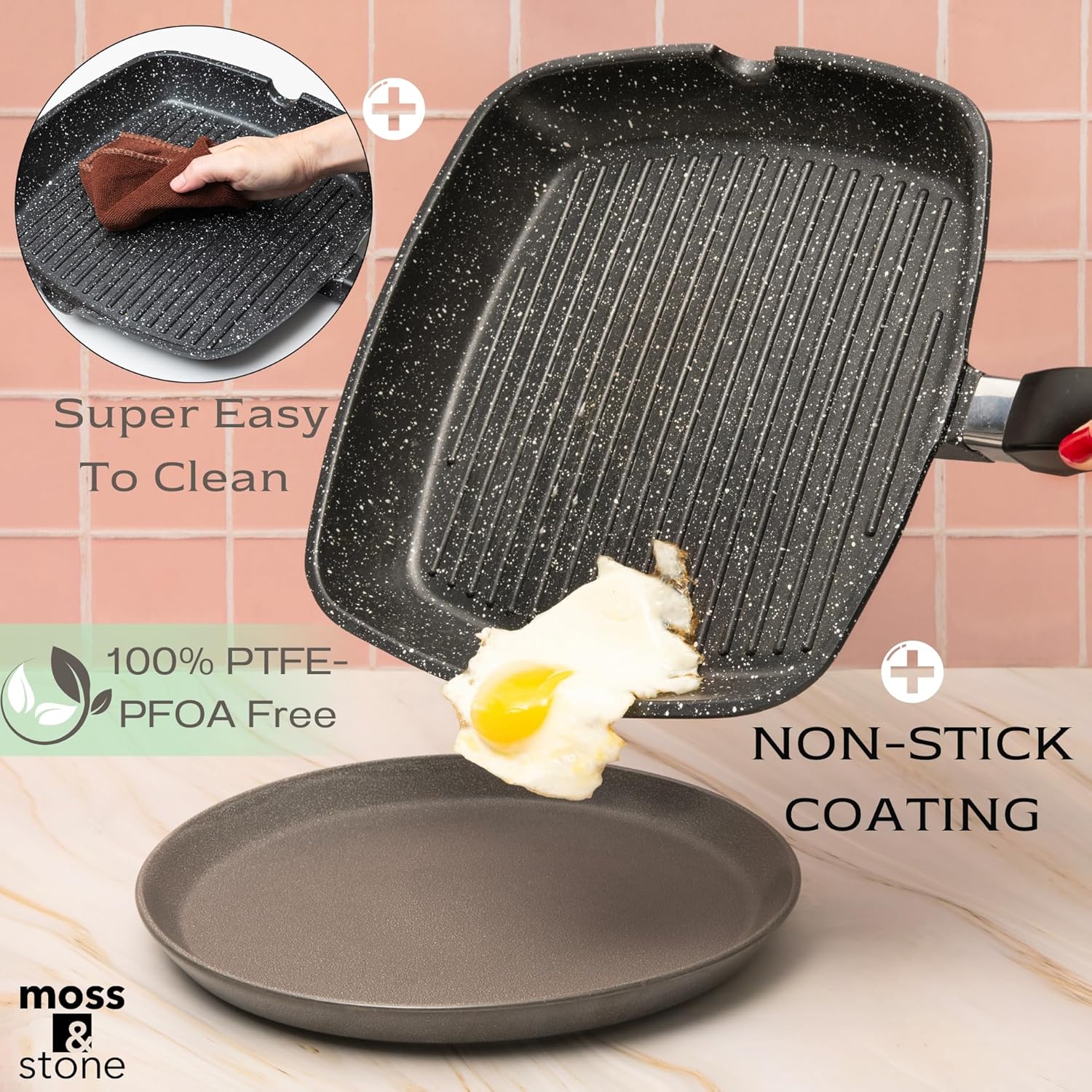 • 11-inch Frying Pan: The Moss & Stone grilling pan is lightweight and easy to use. Its comfortable handle provides an easy and safe grip, ensuring perfect eating enjoyment. The nonstick grill pan also makes cleaning the grease easy, with no stains or scratches.