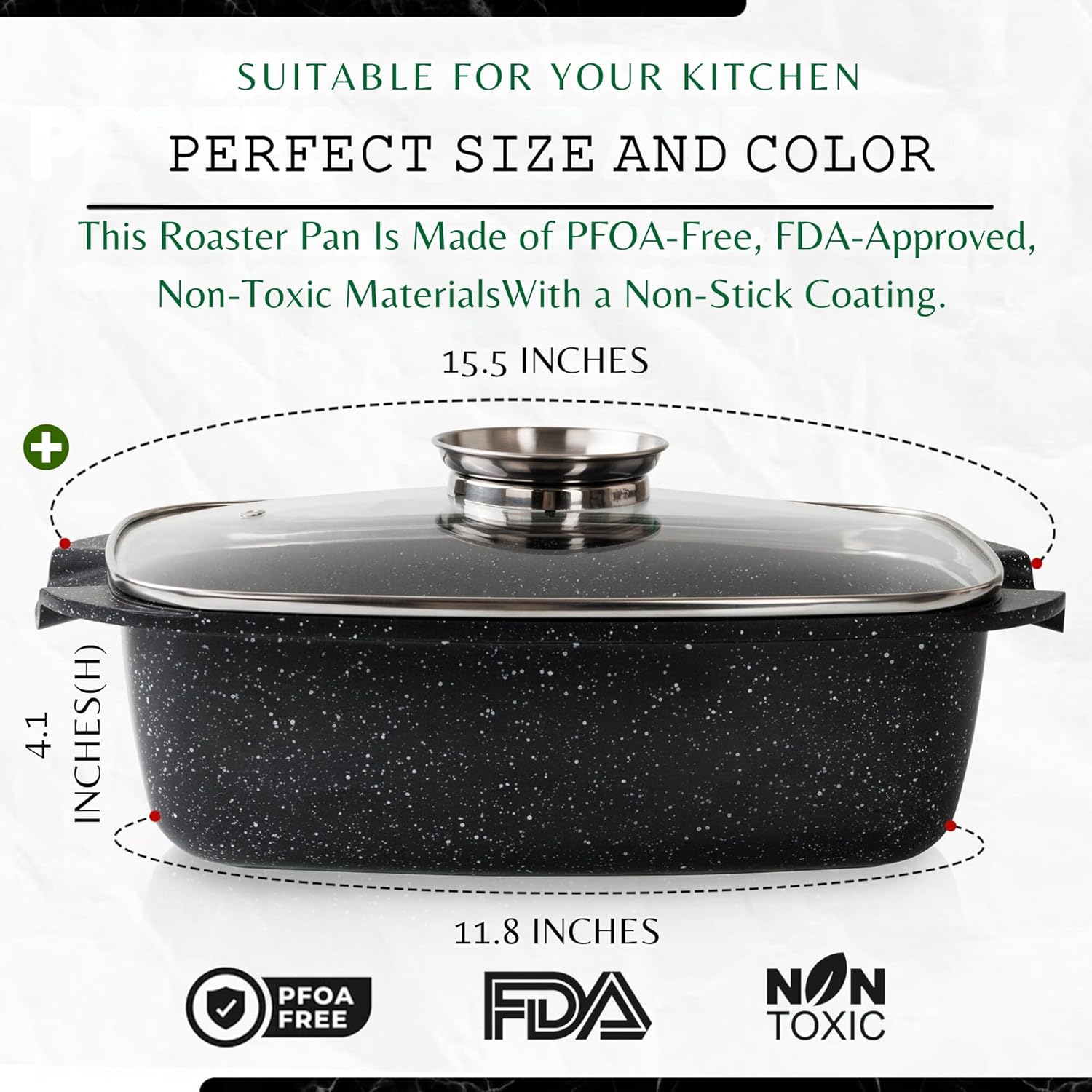 • Non-Stick Roast Pan: This roaster pan is Pfoa-free and non-toxic. The non-stick interior coating allows food to be released quickly. The oval pot 11.8 inch – 4.1 inch deep – 8.3 inch offers solid, heavy-duty construction and superior heat for cooking your delicious meal.