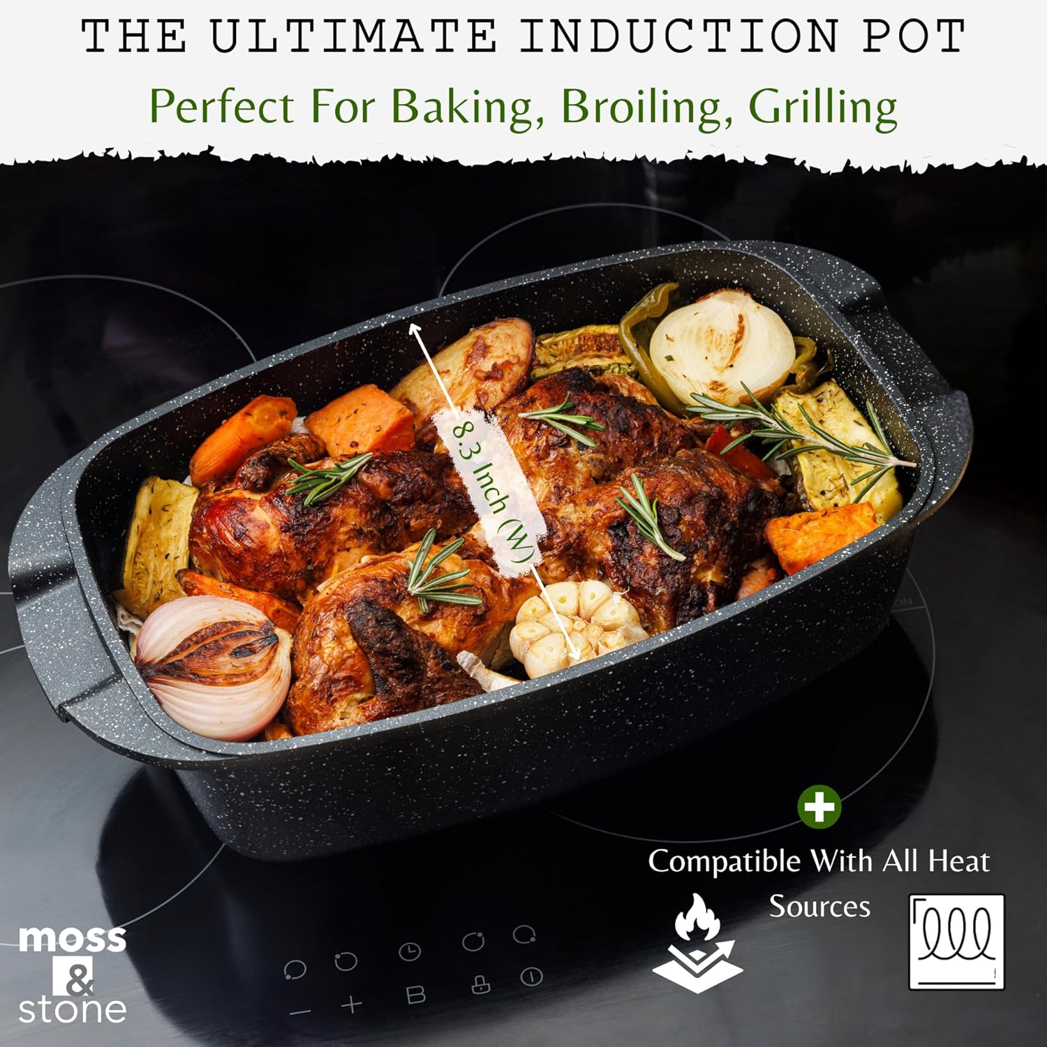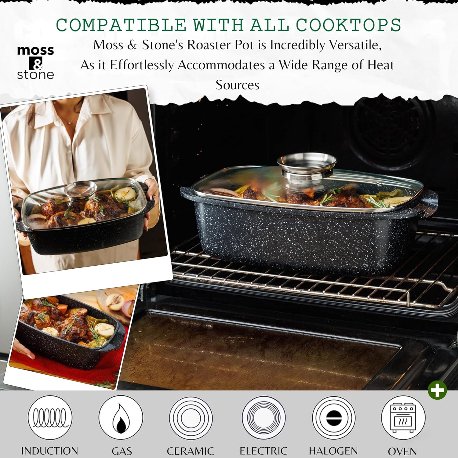 Moss & Stone is a famous company in the field of kitchen appliances & kitchen accessories. We proudly sell you our roasting pot for oven, one of our best sellers. It’s a unique oven roaster pan with lid made of top materials. It’s a versatile nonstick pot with lid that can handle anything from a Thanksgiving turkey to a weeknight rib roast. Use the cast aluminum pot for deep dishes with sauce and as casseroles! We offer our large pot for cooking at a fantastic sale so that you can enjoy a good & cheap large induction cooking pot!!
