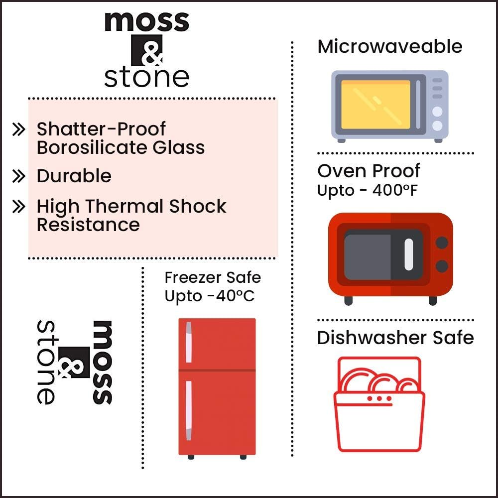 Glass food containers with lids by Moss and stone You can prepare, cook, serve, and store all in the same vessel. Made from borosilicate glass, these food prep containers are heat, scratch, and stain resistant for durability and long-lasting use. They are also thermal shock resistant so they can be used in the freezer, oven, microwave and dishwasher safe. (Not the Lids)