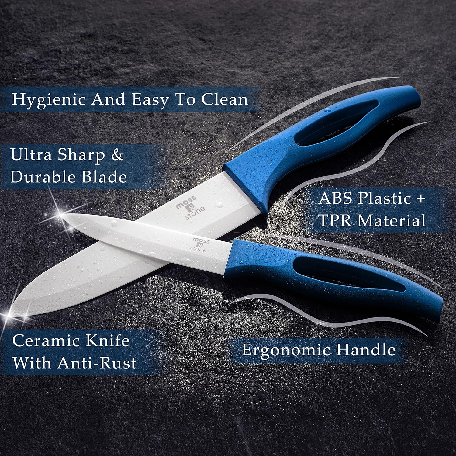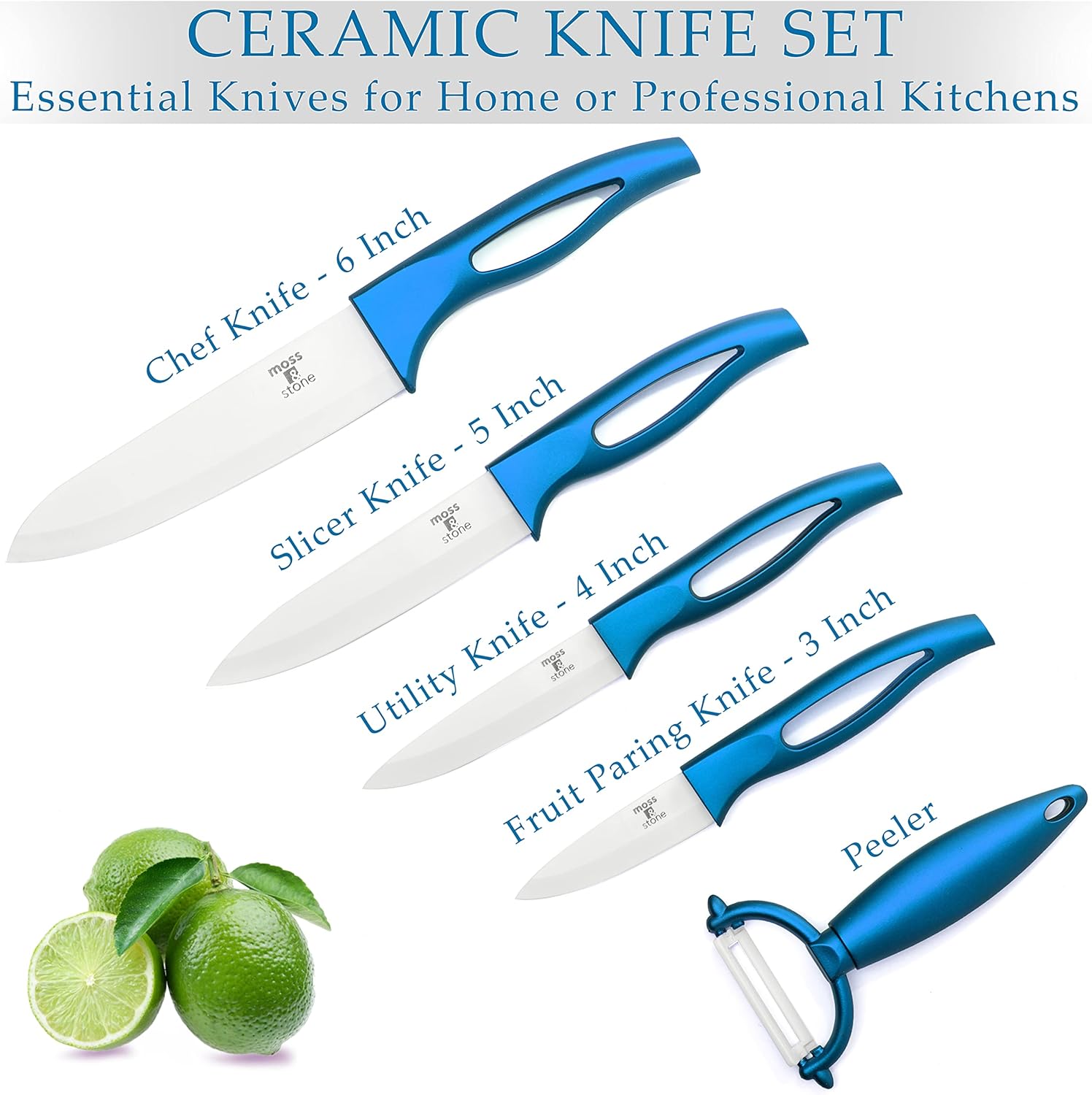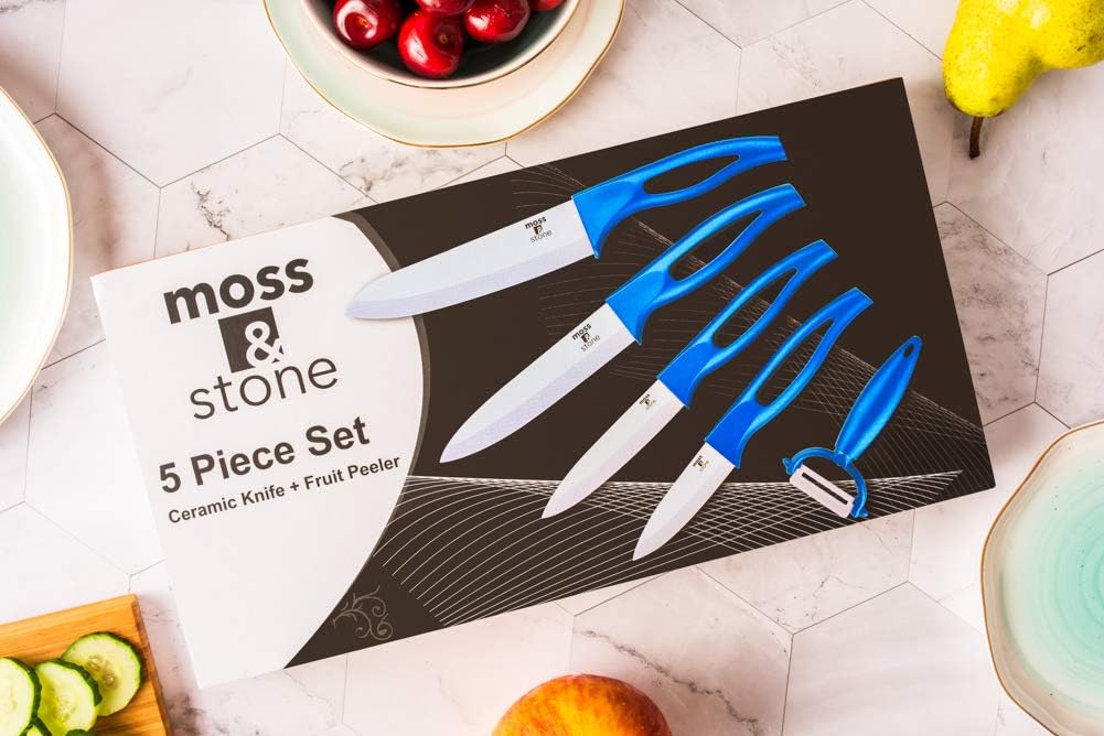 Blade Material: Ceramic Knife Set Ceramic Handle Material: ABS+TPR Color: Metallic Blue Multiple Purpose Cutting Ceramic Knives: Chef Knife Size: 6 inch, Utility Knife: 5 inch, Utility Knife: 4 inch, Paring Knife: 3 inch Sharper and Harder: no sharpening needed Hygienic and easy to clean: Ceramic paring knife set is easy to clean and does not rust. The ceramic does not absorb any food elements. Y-Shape Ceramic Fruit and Vegetable Peeler: Peel the skins off slippery and waxy fruits and vegetables. Warnings: 1.Ceramic Knife Set keep the knife away from children. 2.Knife Ceramic Set do not use ceramic knife for chopping bone, prying, striking. 3.Ceramic knives do not try to put the knife into the dish-washing machine. 4. Paring knife Set do not put your hand towards to the blade for testing the sharpness 5.Do not try to sharpen the knife, there’s no need of sharpening Package Includes: 1 x 6″Ceramic Chef Knife 1 x 5″Ceramic Chef Knife 1 x 4″Ceramic Utility Knife 1 x 3″Ceramic Paring Knife 1 x Ceramic Fruit and Vegetable Peeler Ceramic Knife Set and Fruit Peeler Rust Proof And Stain Resistant, Kitchen Chef Knife Sharp Set With Nice Gift Box (5 pieces) By Moss And Stone |