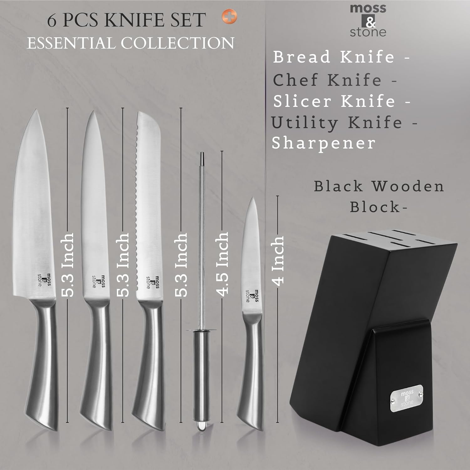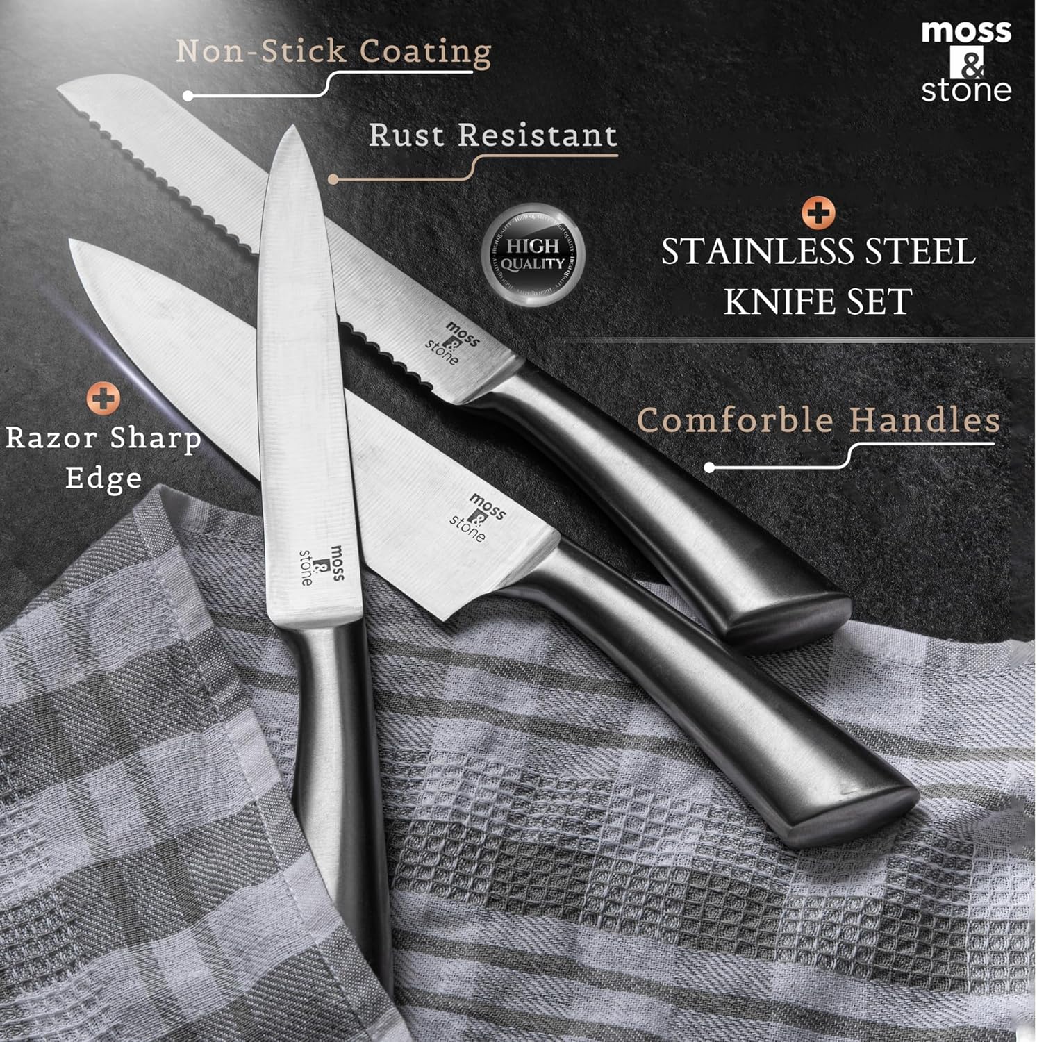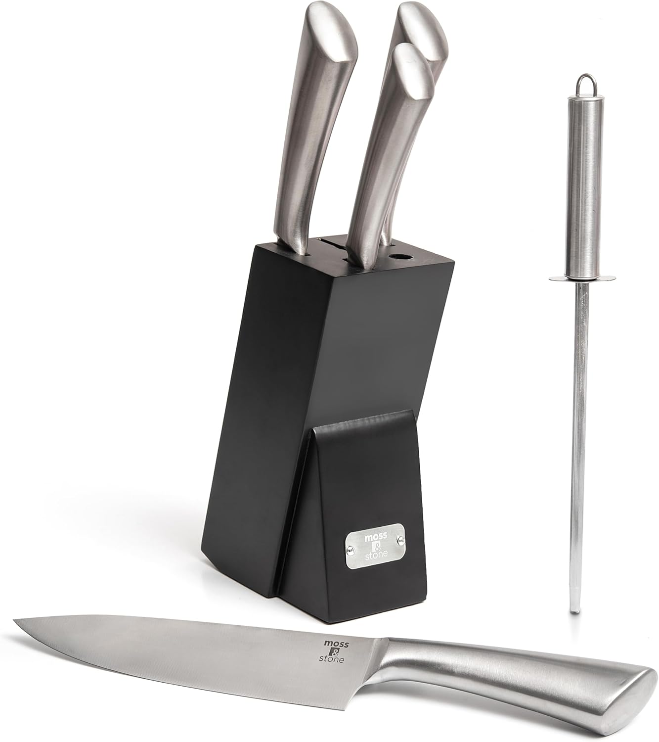 Moss & Stone is a famous company in the field of kitchen appliances & coffee accessories. We are proud to sell you our knives set for kitchen which is one of our best sellers. It’s a unique small knife set made of top materials. We offer our knife set with sharpener at an amazing sale, so that you can enjoy a good & cheap knive set!!